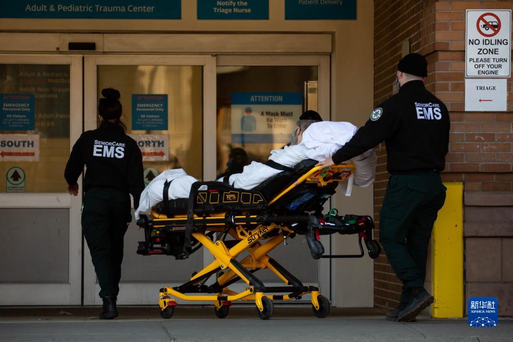 这是3月8日,美国纽约的医护人员在医院外运送病人。新华社发(郭克摄)