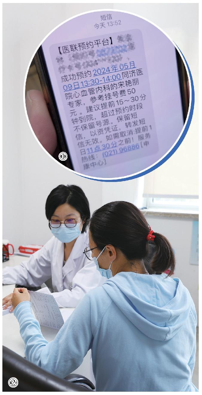 ①甘泉街道社区卫生服务中心家庭医生张鹏为病人转诊至上级医院。 本报记者 李晨琰摄 ②闵行区莘庄社区卫生服务中心家庭医生周小娟为居民预约上级医院专家号。 (采访对象供图)制图:李洁