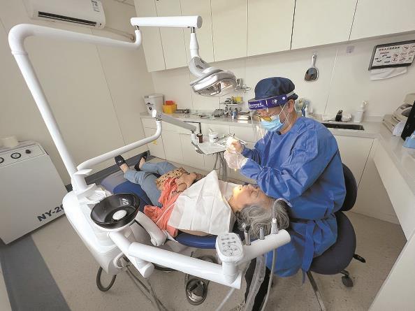 在康健街道社区卫生服务中心,口腔科医生为患者手术 查文澜 摄