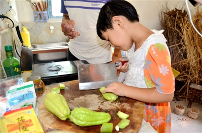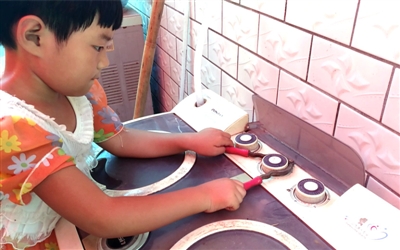 1 核桃夹子拧洗衣机旋钮 “姑娘儿,你把衣服抱出来洗了嘛。”昨日,夹江县木城镇新农村7组,47岁的周发丕蹒跚地走出厨房,“使唤”着女儿蕾蕾。不一会儿,蕾蕾抱了一摞衣服出来,径直走向洗衣机。站上一个约20厘米高的小凳子,蕾蕾将衣服丢进了洗衣机。 周发丕打开洗衣机进水管阀门,水放得差不多了,蕾蕾拿起洗衣粉往洗衣机里倒。“怎么打开?搞忘了没有?”周发丕望着蕾蕾,她不太熟练地拿起放在洗衣机盖上的核桃夹子,夹着洗衣机旋钮转动。蕾蕾用核桃夹子转了4次,才将洗衣机时间旋钮转到位。 临近中午,蕾蕾站上凳子,用铲子将电饭锅里的剩饭铲松,然后打开开关热饭。蕾蕾又将洗干净的佛手瓜放在菜板上,慢慢地切块,动作还不是很熟练。不过,每天蕾蕾已经习惯了这些家务,尽管她还只是个6岁多的孩子。