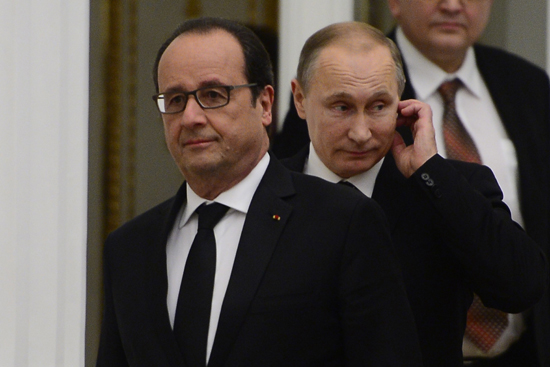 当地时间2015年11月26日,俄罗斯莫斯科,法国总统奥朗德与俄罗斯总统普京召开新闻发布会。俄法商定在叙利亚进行反恐方面开展双边协作,并与美国领导的打击极端组织“伊斯兰国”国际联盟开展协作。CFP供图