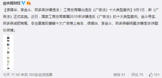 广告 该广告涉嫌违反了《中华人民共和国广告法》第十条“广告使用数据、统计资料、调查结果、文摘、引用语,应当真实、准确,并表明出处”的规定,属于广告使用数据未表明出处的违法行为。同时使用消费者的名义或者形象做证明,违反了《食品广告发布暂行规定》的有关规定。 7、 一碗泄油瘦身汤 该广告涉嫌违反了《中华人民共和国广告法》第十条“广告使用数据、统计资料、调查结果、文摘、引用语,应当真实、准确,并表明出处”的规定,属于广告使用数据未表明出处的违法行为。同时使用消费者的名义或者形象做证明,违反了《食品广告发布暂行规定》的有关规定。 8、 郑多燕减肥晚餐 “郑多燕营养晚餐”是普通食品,生产许可证号为:QS440106015152。广告中均出现“用郑多燕减肥晚餐,保证让你瘦下来不节食不运动躺着就能让你瘦不腹泻不反胃没有一例副作用郑多燕减肥晚餐1周减掉10斤油30天狂甩一身肉用郑多燕减肥晚餐只要一个月,保证让你瘦下来3大瘦身新突破1、7天断肥根2、15天排肥油3、终身不反弹”等内容,使用数据无法证明真实、准确,且未表明出处。该广告涉嫌违反了《中华人民共和国广告法》第十条。 9、 冬虫夏草胶囊 该广告出现了与药品相混淆的广告用语,宣称具有治疗作用,涉及疾病预防及治疗功效,并出现医生、医疗机构的名义和形象,使用专家、消费者作证明。 10、 舒尼迩滴耳油 该广告中宣称“老年性耳聋、噪音性耳聋、神经性耳聋……”如果使用了该产品就会“交流无障碍,听力恢复得和正常人一样了”,同时使用患者形象作证明。涉嫌违反了广告法的相关规定。 同时,国家工商总局也提醒消费者,如果在生活中遇到了违反广告法的案件,请及时举报。 相关报道:新广告法下月起正式实施 10岁以下童星将告别代言(来源:信息时报) 信息时报讯(记者郭苏莹) 下月起,电视、网络等广告中将难见到不满10岁的童星代言人;各类明星也告别“任性代言”,接广告代言需使用过产品……新广告法将于9月1日正式实施,广东省工商局昨日召开新闻发布会,就新广告法实施细则进行解读。 亮点1:明星告别“任性代言” 明星代言各类生活用品、男星代言女性用品、童星代言药品……在新广告法中这些情形将受到限制。根据规定,广告代言人不得为未使用过的商品或未接受过的服务做代言。 省工商局广告处处长林阳表示,广告代言人主要是为商品或服务作推荐、证明,如果本身都没有使用过商品或者接受过服务,其推荐和证明将不能代表其独立意见。“要求广告代言人必须先行体验,可以提高其责任意识,也符合广告真实性原则的要求。”林阳还介绍,“广告代言人在使用商品或接受服务后,明明知道广告所述内容与实际情况不符,或者按照一般人的常理均知道广告内容为虚假的,一旦有上述情况,广告代言人仍然要代言的,就要承担连带责任。” 亮点2:加大对未成年人保护 伊利QQ星、小天才电话手表……下月起,因“爸爸去哪儿”火起来的森碟、天天等不满10周岁的童星代言人,或将在广告中暂别公众视线。新广告法规定,未满10周岁的未成年人不得代言。 林阳表示,虽然法律禁止未满10周岁的未成年人进行代言,但并不禁止未满10周岁的未成年人参与广告表演,所以并不意味着以后的广告都不能出现10周岁以下未成年人的名义或者形象。 “但对于童星来说,由于他们属于公众人物,参与表演也具有代言人的效果,因此也属于禁止范围,在9月后,他们参演的广告将禁止播出。”林阳说。 [责任编辑:管健铭]