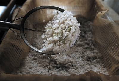 昨日,在该假醋窝点,勾兑假醋的水池上放着粗颗粒的盐,勾兑时添加用。