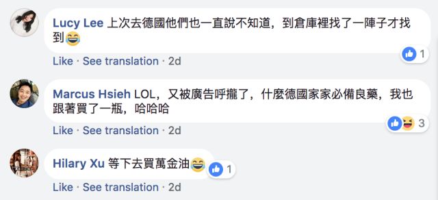 有网友也有类似经历。一位德国药剂师很狐疑问道:为什么亚洲人都来扫货,你们那里没有卖吗? 报道称,其实德国百灵油起初就叫作“中国油”,是德国人到北京学成后带回来的,后来台湾专业药剂师伍庆云将它改名“德国百灵油”,成功引起消费者的兴趣,但价格也翻了好几倍,因此广为台湾人所知。百灵油强调可涂抹皮肤、蒸汽吸入或滴入热水中饮用。 对于德国人不爱百灵油反爱“中国油”,引来许多台湾网友共鸣,纷纷在贴文下方留言: