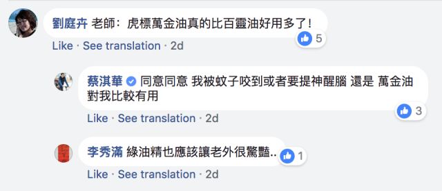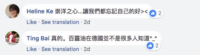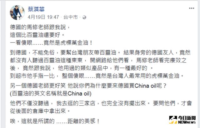 台湾民众到德国旅游时,都指明要买在台湾很红的“德国百灵油”,这已经成了他们的扫货“圣品”。但最近一位台湾高中老师去德国才发现,德国人觉得最好用的却是“虎标万金油”,当地人称“China Oil”(中国油)。 另有一位德国老师也疑惑问道,你们为什么要来德国买China oil呢?百灵油的英文名称就是“China oil”(中国油)。 蔡淇华说,和友人逛了三家店,也完全没人摆出百灵油来卖,询问之下才从后面仓库拿出来,不禁感叹“这就是所谓距离的美感!”。