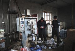 昨日,天津独流镇西北民主街附近一假醋窝点,灌装机边,执法人员正在现场检查。灌装机后是一个简易的水塔,里面是勾兑好的假醋。A12-A13版摄影/新京报记者大路 昨日,在该假醋制造窝点,大池子里装满了勾兑好的假醋,等待灌装。 昨日,在该假醋窝点,勾兑假...