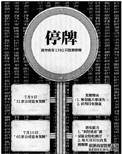 随着行情逐步企稳回升,越来越多的公司将加入到“复牌潮”中。但千余只个股找出个像样的复牌理由,真的是难为上市公司董秘,各种奇葩借口纷纷出炉。网友还杜撰了一段子,“一公司申请停牌的原因是董事长失踪,复牌理由是,现查明董事长昨天待产生孩子,今已顺产,母子平安,现申请复牌。对此上交所回复‘当满月后再说吧’。”嬉笑怒骂之后,值得关注的是,千余家上市公司复牌后是顺势冲高还是补跌?接下来的上市公司“复牌堰塞湖”将如何疏导?投资者又该如何操作? 对于股民来说,惊心动魄的一周刚刚过去,而上市公司也是如此。 股市暴跌过程中,一度出现两市上千家股票停牌的奇特景象。上市公司停牌数量高峰期时,有高达1400多家上市公司申请了停牌。但上周四行情出现戏剧化扭转,大量公司又抢着复牌。据不完全统计,仅7月9日一天,两市就有31家公司宣布复牌。7月10日,两市又有65家公司宣布复牌。两日内,有将近百家公司复牌,且多数是停牌两天之内便复牌,其中不乏停牌一日后闪电复牌。这些公司复牌后股价纷纷大涨。截至7月10日收盘,两市尚有1382只股票停牌,接近上市公司总数一半。 最会踏节奏的上市公司:乐视网、东方财富 在A股此前切换至急跌模式后,几乎所有的上市公司都被卷入非理性下跌的漩涡,很多曾经吸引力十足的利好消息,也难以阻挡股价回落的步伐,于是,一波史上最大的停牌潮来袭。最多时有高达1400多家上市公司申请了停牌,已超过沪深两市个股总数的一半。 在市场信心接近崩溃的边缘,连串重大利好助推行情发生逆转,7月9日收盘1200多只股票涨停,7月10日继续延续升势,两市逾1300只个股涨停,被形容为A股又一大奇迹日。 随着行情的戏剧化反转,一些上市公司反应迅速。以乐视网和东方财富为代表的多只个股仅在停牌一日之后就闪电复牌,在A股整体强势反弹的背景下,成为资金追捧对象。 以在前期大跌中曾被视为“创业板标杆”的乐视网为例,公司在周一、周二连续跌停之后,周三加入“停牌大军”,不过,7月9日迅速复牌,而且还带着1000万元投资北京益动思博网络科技公司的利好消息而来。7月9日乐视网虽然低开后大幅震荡,但下午开盘后不久即成功站上涨停板。7月10日继续涨停。 巧合的是,同样也在停牌一天之后,东方财富也在2.5亿元投资易真网络科技的消息下复牌,然后也同样是华丽丽的涨停。此外,一起复牌的唐德影视、特锐德等也悉数涨停。 随后越来越多的上市公司又转身加入“复牌”的行列当中,海信电器、格力地产、苏宁云商、精诚铜业、格林美等公司均上演了类似的复牌大戏,其股价也相继飙涨停。 上市公司的N种奇葩复牌借口 有意思的是,就像停牌时一样,上市公司要找出合理的“借口”,复牌也同样要把理由说得“像模像样”,起码要自圆其说。这可难坏了上市公司的董秘们。有股民在微博上笑称,连续千股涨停,而停牌的千股用什么理由复牌?这真是好考验上市公司的智商。因此,各种奇葩的复牌借口也纷纷出炉。 有多家沪市复牌公司,出现了闪电谈判崩盘或闪电筹划重大事项失败等奇葩公告。 红豆股份宣称,因筹划受让深圳利合创业投资有限公司部分股权,自7月9日起停牌,7月9日当晚即公告称因存较大不确定性,决定停止筹划,第二天复牌。 金瑞矿业则筹划收购控股股东的煤炭业务,7月9日起停牌,经论证条件尚不成熟,宣布第二天复牌。 *ST海润7月8日申请了全天停牌,其表示,公司因相关事项是否涉及重大事项存在不确定性。但此后又发布公告称,经过核实,上述事项属于公司日常经营业务的一部分,不涉及《股票上市规则》的停牌事宜。7月9日迅速复牌。 而双良节能自7月8日起停牌,其公布的重大事项为对外投资事项,自停牌之日起与对方谈判,到7月9日(经过两天),双方分歧较大,决定终止合作谈判,7月10日复牌。以类似理由闪电停牌复牌的上市公司还有方大炭素、香溢融通和广州发展。 赛轮金宇的员工持股计划也是“来去自如”。因筹划员工持股计划,该公司于7月7日起停牌,但没两天又申请7月10日复牌,称停牌期间,“多数员工代表认为目前推出员工持股计划的市场时机尚不成熟,建议公司等市场条件成熟后再行推出该计划”。 龙马环卫在不久前的6月25日刚发布了对员工的限制性股票激励计划,为“筹划终止实施激励计划”,特地自7月8日起停牌。两天后终止完成,龙马环卫宣布复牌。 有意思的是,海信电器于7月8日晚间公告称拟发布关于电视产品技术和产业升级的重大信息,为避免股价异常波动,于7月9日起停牌。而9日晚间,海信电器正式在公告中发布了自己的高端电视产品ULED,申请7月10日复牌。对此,有股民笑称,前几天股价持续暴跌,上市公司想方设法停牌,恨不得哭晕在键盘上,现在又费尽心机复牌,借口真是千奇百怪,真让我们笑晕在键盘上了。 千余家上市公司复牌是顺势冲高还是补跌? 毫无疑问,随着后续市场继续走好,会有越来越多的公司提前选择复牌。但千余家上市公司复牌对市场有何影响呢?对此,西南证券首席策略分析师张刚表示,大量上市公司复牌,会增加股票卖出的供应量,但在大涨行情下,会促成投资者保持持股信心,影响也较为有限。 资深市场人士李德林则持不同观点,他日前撰文指出,6月到7月8日,两融的余额净流出是5886亿元。这意味着现在股市里的钱差不多回到3月底的水平。“5886亿