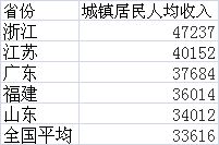 国家统计局日前发文称,十八大以来,我国居民收入持续较快增长,2016年城镇居民人均可支配收入33616元,比2012年增长39.3%,实际增长28.6%,年均实际增长6.5%。 城镇居民人均可支配收入,长期以来作为反映一个地区居民收入水平和城市经济发展水平的重要指标,是了解居民生活变化水平情况的基础。 那么分地区看,各地的收入水平如何?第一财经记者通过选取东部沿海发达地区直辖市以外的5个经济发达的省份(浙江、江苏、广东、福建、山东),对其各个地级市城镇居民人均收入进行统计梳理,发现在这东部5省中,浙江最为富裕,其所有地市人均收入均超过全国平均水平,广东、江苏均存在一定的区域差距。 浙江11地市均超全国水平 统计数据显示,在东部5省中,浙江的富裕度最高,是全国唯一一个省内所有地级市的城镇居民人均可支配收入都超过全国平均水平的省份。 2016年,浙江全省城镇常住居民人均可支配收入47237元。在浙江的11个地市(含副省级城市)中,杭州、宁波这两大副省级城市以及绍兴均超5万元大关,位居全国前列,此外嘉兴和舟山也都超过了4.8万元。值得注意的是,这些城市刚好是环杭州湾分布。 今年6月发布的浙江第十四次党代会报告首提“大湾区”概念,谋划实施“大湾区”建设行动纲要,重点建设杭州湾经济区,这也是粤港澳大湾区之后,又一个大湾区的规划。 杭州湾之外,温州、台州、金华和湖州的城镇居民人均可支配收入也都超过了4.5万元。即使是发展相对滞后的浙西南,衢州和丽水也分别达到了36188元和35968元,比全国平均水平高出了2000多元。 浙江省党代会报告起草组在解读省党代会报告时分析,浙江城乡居民人均收入已分别连续16年和32年居全国省区第1位,“富”的方面已经有较好的基础。“富”,主要体现为居民、企业、财政三大收入保持较高水平、持续较快增长,最核心的是人民群众生活富裕。 以2016年为基期,按照城乡居民人均可支配收入分别年均增长7.5%和7.8%测算,到2022年该省城镇居民人均可支配收入预计将超过7万元,农村居民人均可支配收入将超过3.5万元。 在2016胡润百富榜中,从企业家出生地来看,浙商人数仍然排名第一。若考虑到人口基数,浙商的领先优势就更加明显。2015年,浙江总人口为5539万人,位列国内各省份第10位,仅相当于广东、山东的一半左右。 来自浙江诸暨、目前在广州创业的陈新明告诉第一财经记者,浙江商人更拼,更有冒险精神。在以“互联网+”为代表的产业转型升级过程中,浙商也走在了前列。“在许多地方,年纪到了五六十岁的企业家就准备退休了,但在浙江,很多人仍在想着要创业、要干事业。” 厦门大学经济学系副教授丁长发分析,浙江是中国市场化程度最高的省份,无论是劳动力要素、土地等制度创新都走在全国前列,大大降低了经济发展中所需的各种成本、费用。浙江最早在全国实行省管县,县域经济、乡镇经济都十分发达,每个县都有自己的产业集群,形成了强大的产业竞争力。 东部5省及全国城镇居民人均可支配收入(单位:元)