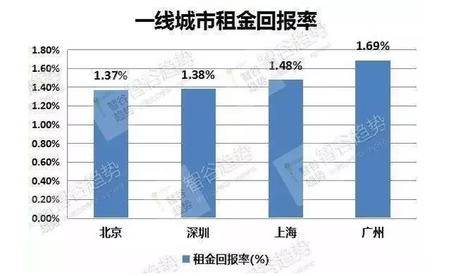 资料图 四个城市中,北京的租金回报率最低,以1.37%在百城里排名第96位,其次是深圳(1.38%)、上海(1.48%)和广州(1.69%)。排名分别为第94位、89位和95位。