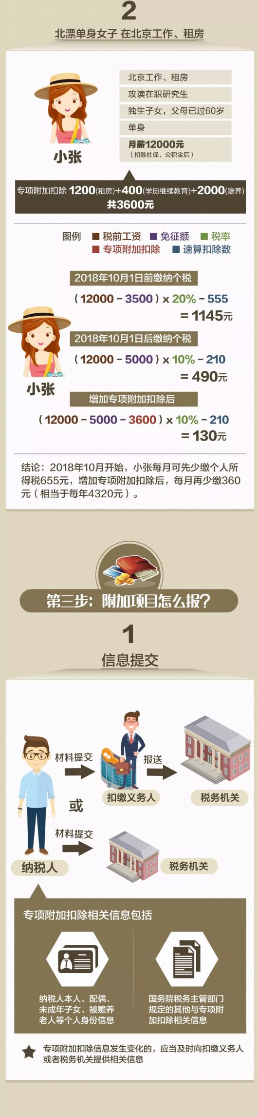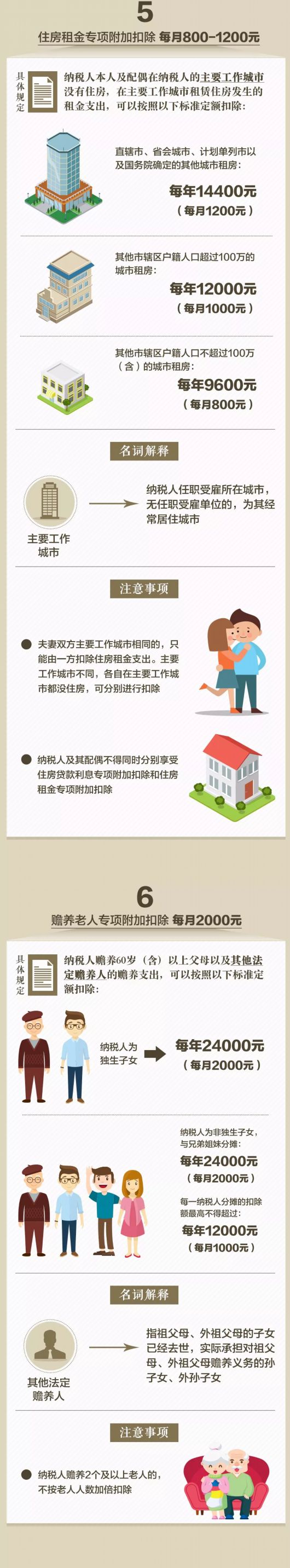 来源:人民日报 作者:李丽辉 吴秋余 一张图算清:个税专项附加扣除让你多拿多少钱 10月20日起,财政部、国家税务总局会同有关部门起草的《个人所得税专项附加扣除暂行办法(征求意见稿)》(以下简称《暂行办法》)在两部门官网向全社会公开征求意见,之后,将依法于2019年1月1日起实施。 《暂行办法》明确了个人所得税法规定的子女教育、继续教育等6项专项附加扣除的具体实施办法。享受这些专项附加扣除,需要哪些条件?通过这些扣除项目,纳税人可以少缴多少个税?跟随下面这张图,一起来算算。