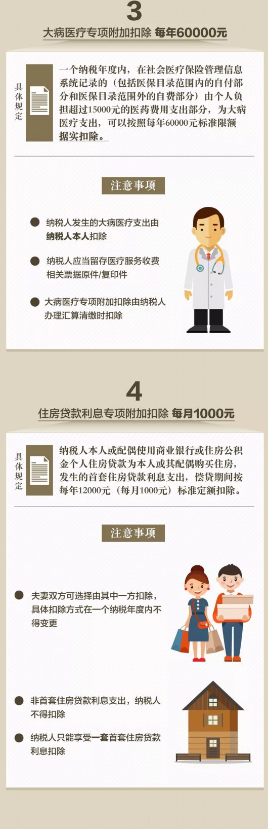 暂行办法20日开始公开征求意见 10月20日,财政部、国家税务总局网站公布《个人所得税专项附加扣除暂行办法(征求意见稿)》,向社会公开征求意见。征求意见截止日期为11月4日。完成相关程序后,暂行办法将依法于2019年1月1日起实施。 今年个税改革力度很大,在提高起征点的同时,还首次增加了子女教育、继续教育、大病医疗、住房贷款利息或住房租金,以及赡养老人等专项附加扣除。由于改革方案内容多、涉及面广,所以个税改革在实施上分两步走:10月1日起,个税起征点由原来的3500元上调至5000元,很多人都已享受到改革红利;个税专项附加扣除则自2019年1月1日起实施。 这些专项附加如何抵扣,个人能够减轻多少税负?备受社会关注。此次暂行办法征求意见稿,明确了六大专项扣除的原则和标准,相关专家对此进行了解读。 子女教育、赡养老人等支出,均可抵扣个税 根据暂行办法,个税专项附加扣除遵循公平合理、简便易行、切实减负、改善民生的原则。具体扣除标准如下: 子女教育:纳税人的子女接受学前教育和学历教育的相关支出,按照每个子女每年12000元(每月1000元)的标准定额扣除。 继续教育:纳税人接受学历或非学历继续教育的支出,在规定期间可按每年4800元或3600元定额扣除。 大病医疗:纳税人在一个纳税年度内发生的自负医药费用超过1.5万元部分,可在每年6万元限额内据实扣除。 住房贷款利息:纳税人本人或配偶发生的首套住房贷款利息支出,可按每月1000元标准定额扣除。 住房租金:纳税人本人及配偶在纳税人的主要工作城市没有住房,而在主要工作城市租赁住房发生的租金支出,可根据承租住房所在城市的不同,按每月800元到1200元定额扣除。 赡养老人:纳税人赡养60岁(含)以上父母的,按照每月2000元标准定额扣除。 “从这些专项附加扣除的标准来看,一个总的基调就是‘宽’,较好地遵循了公平合理、切实减负、改善民生的原则。”中国财政科学研究院研究员孙钢认为,个税改革扣除涉及几亿人,每个人的具体情况又不一样,怎么抵扣、抵扣多少是很大的难题。从操作层面看,方案尽量把复杂问题简单化,让老百姓看得明白,税务部门实施起来简便易行。 “上面6项扣除中,只有住房租金的扣除标准是分区域的,其他几项扣除全国都是一个标准,这样就大大降低了操作难度。”北京大学教授刘怡表示,特别是对子女教育,抵扣范围从学前教育一直到博士研究生教育,子女从3岁到30岁的教育差不多都涵盖了,这个力度还是很大的。 假设月入2万元享受4项附加扣除,个税可降七成 很多中年人上有老下有小,中间还有房贷,他们可以享受的专项附加扣除不止一项。那么,如果一个人同时享受几项扣除,加起来能省多少税呢? 专家算了这样一笔账:对大多数人来说,大病医疗并非日常支出,这个可以先刨除在外。剩下的5项扣除中,贷款利息和住房租金只能选其一,这两个专项扣除是不能同时享受的。所以,可以同时享受的大致是4项:子女教育、继续教育、住房租金或房贷利息、赡养老人。 假设这位纳税人的月工资为2万元(不考虑三险一金),个税改革前起征点是3500元,他每月应缴纳个人所得税3120元。 今年10月1日以后取得工资,按每月5000元基本减除费用标准和调整后的税率表计算,应缴纳个人所得税1590元,税负降低了近50%。 2019年1月1日后取得工资,每月再享受4项专项附加扣除:子女教育专项附加扣除1000元,继续教育专项附加扣除400元,住房租金专项附加扣除1200元,赡养老人专项附加扣除2000元,共计扣除4600元。也就是说,这位纳税人的工资在扣除5000元起征点后,还要再扣除4600元,剩下的钱才缴纳个税。这样,他每月应缴纳的税款为830元,比10月份又省了760元的税。 “月入2万元,个税改革前每月应缴个税3120元,改革后提高起征点加上4项附加扣除,可少纳税2290元,税负水平降低73.40%。这样一个减税力度,老百姓是能够切实感觉到的。”西南财经大学经济与管理研究院院长甘犁说,当然减税幅度是因人而异的,要看个人的工资收入和能够享受多少附加扣除。总体上,家庭负担越重的人可享受的扣除就越多。 根据民生支出变化,将适时调整扣除范围和标准 “个税改革关系百姓切身利益,广大群众都特别关心,也提出了很多好建议和‘金点子’,为解决难题支招。方案出台后再次公开向社会征求意见,体现了开门立法的精神。” 中南财经政法大学教授许建国说,此次暂行办法在制定时,财税部门采取了无方案征求意见的方式,广泛听取了全国各地专家学者、群众代表的意见,他本人也在湖北参加了座谈会,对此感触很深。 “从税收征管层面看,暂行办法的一大特点是信任纳税人、方便纳税人。”许建国表示,纳税人首次享受专项附加扣除,需要提交相关信息,包括纳税人本人、配偶、未成年子女、被赡养老人等个人身份信息。提交的渠道有两个:既可以提交给扣缴义务人,也可以直接提交给税务机关,充分考虑到了方便纳税人和保护隐私问题。 “大规模的个税专项附加扣除,以及纳税人自行申报缴税,对税收征管来说都是头一回,还有许多地方需要完善和磨合,对此大家也要有心理准备。”孙钢说,专项附加扣除牵涉的环节很多,将来个人申报时网络会不会“塞车”,信息提交能不能成功,退税是不是及时到账等,很多都是在实施过程中逐步完善的。只有在大家的理解、配合和支持下,个税改