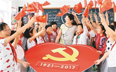 图为江苏省海安县南莫镇中心小学的老师为学生们讲解党徽知识。向中林 摄