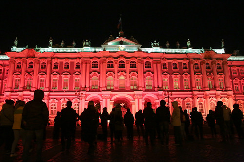 资料图片:10月25日,俄罗斯圣彼得堡冬宫外墙亮起红色灯光,纪念十月革命100周年。新华社发
