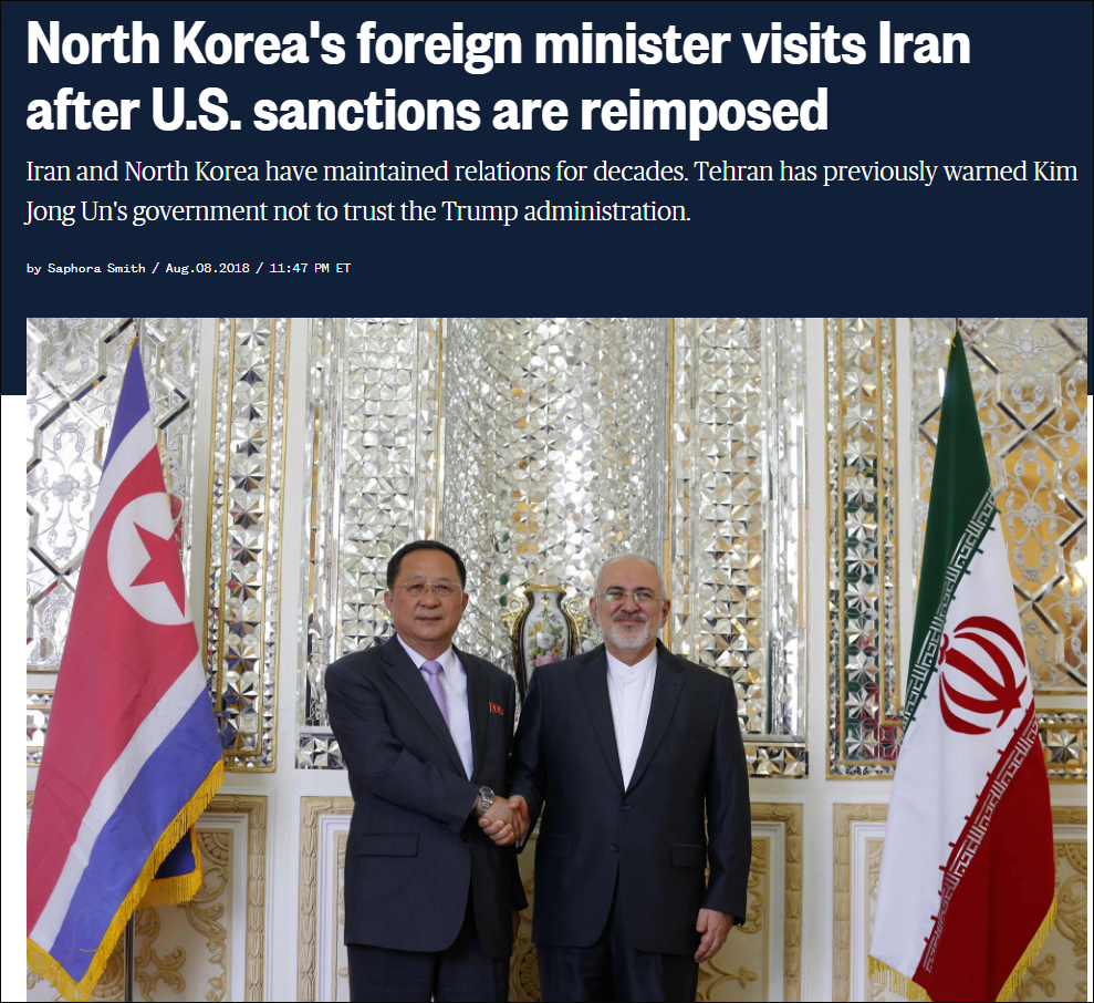 正值美国重启对伊朗制裁之际,朝鲜外务相李勇浩于当地时间7日对德黑兰进行访问,并分别于伊朗总统鲁哈尼、外长扎里夫举行了会谈。