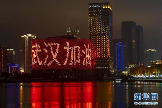 除夕夜,武汉市汉秀剧场外墙打出“武汉加油”字样(图自:新华社)