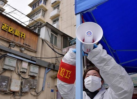 下沉到社区的武汉市园林局职工杨丽青在调试播放防疫事项的喇叭(图自:新华社)