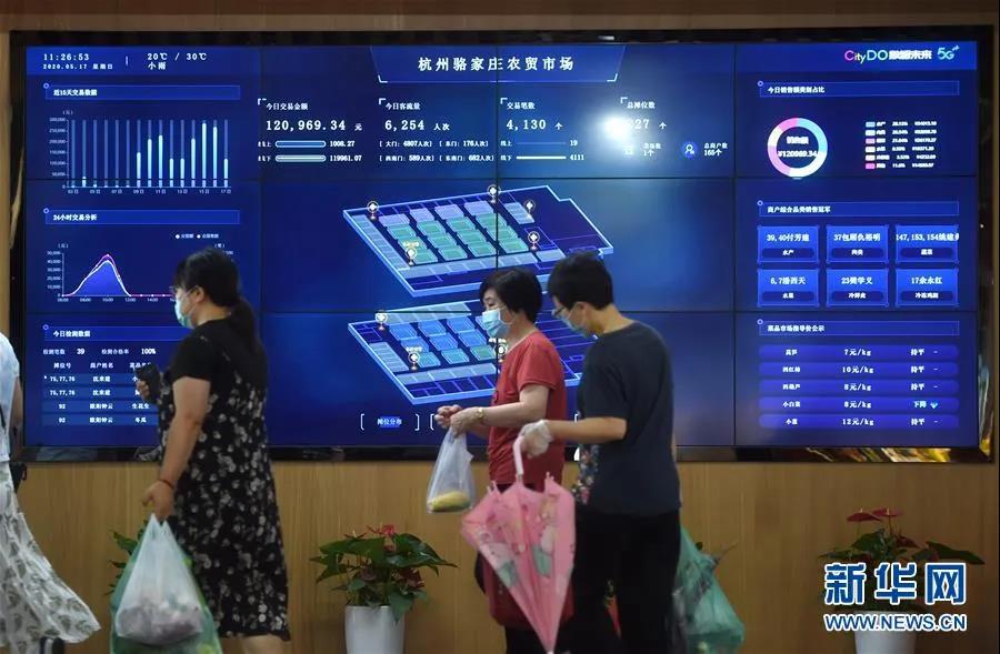 浙江省杭州市的5G农贸市场,骆家庄农贸市场,可以说是智慧农贸市场的代表。5G技术的投入使用,让这个农贸市场实现了“线上+线下”融合,线上可“云买菜”、5G+VR全景直播;线下市场运行多个方面运用了5G、大数据和人工智能等技术。