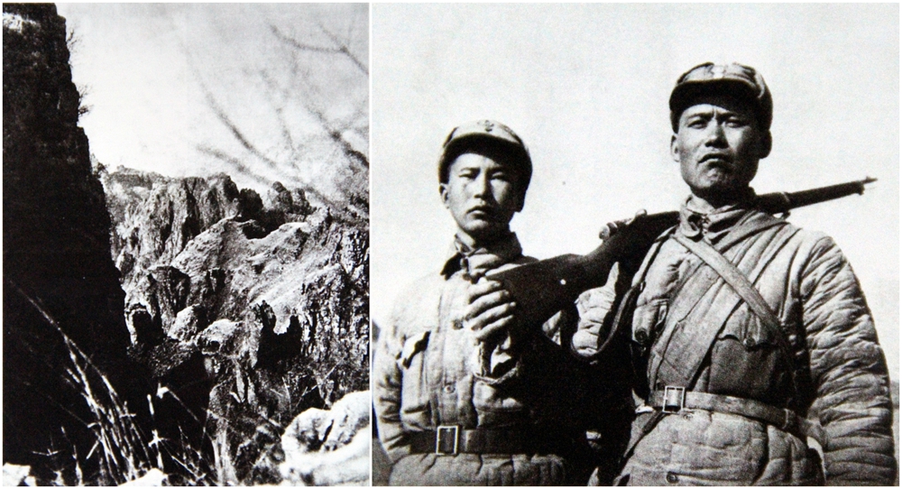 左图是“狼牙山五壮士”跳崖处。右图是幸存者葛振林(右)和宋学义。 新华社发