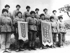 一级英雄杨育才(前排左三)与化装袭击班接受奖旗
