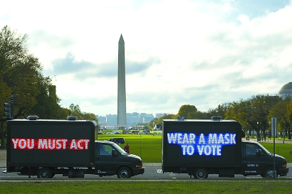 11月1日,在美国华盛顿拍摄的华盛顿纪念碑和路边的竞选标语。 新华社 发