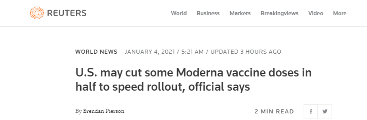 “美国政府在考虑给部分人注射一半剂量的莫德纳疫苗以实现疫苗的快速接种!” 当地时间3日,路透社援引美国联邦政府官员的话发布这一消息。当日,美国累计新冠确诊病例已超2050万,累计死亡超过35万例。
