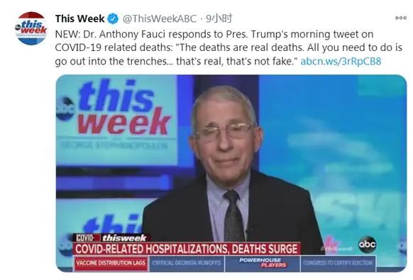 随后不久,福奇接受了美国广播公司(ABC)“本周”(This Week)节目采访。在节目中,主持人玛莎•拉达茨(Martha Raddatz)询问福奇对特朗普推文称新冠病例和死亡人数是“假新闻”、并将其归咎于CDC测定方法的回应。 ![]()