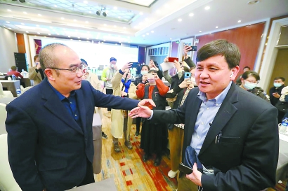湖北省卫健委副主任张定宇(左)和复旦大学附属华山医院感染科主任张文宏(右)疫情后在武汉第二次见面。本报记者 蒋迪雯 摄