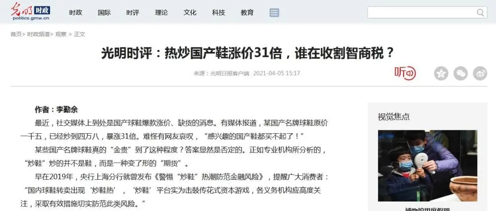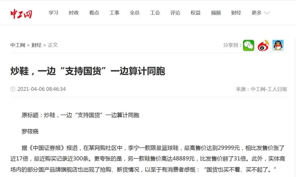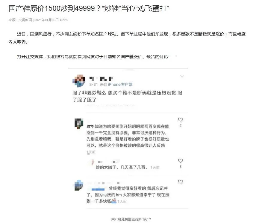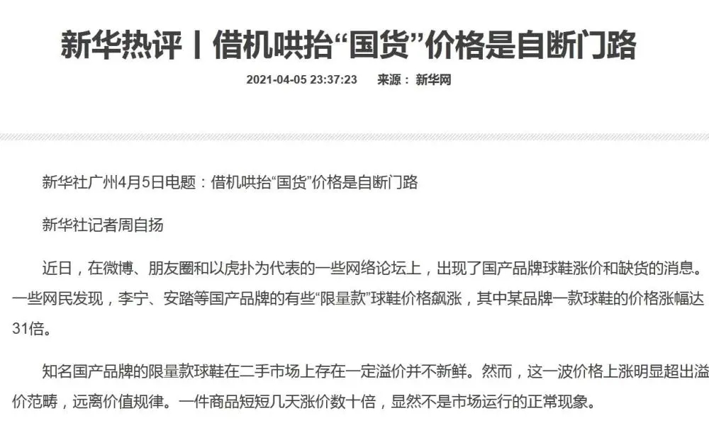 中新经纬客户端4月7日电 (董湘依)刚刚结束的清明小长假,以李宁、安踏为代表的国产鞋价格遭爆炒的话题在网络上刷屏,一度登上微博热搜。一款发售价1499元的李宁韦德之道4银白款,售价高达48889元,涨幅达31倍。随着舆论发酵,六家央媒陆续发声斥炒鞋行为,官方微信中央政法委长安剑发文喊话:“爱国主义怎容投机倒把”“这场炒鞋闹剧,该收场了!”。 ![]() 人民网:消费爱国心炒鞋,邪气必须狠刹! 4月4日,人民网发表题为《人民财评:消费爱国心炒鞋,邪气必须狠刹!》评论文章称,炒鞋只要在法律框架内行事,并非不可。但是,如果把这股来势汹汹的炒鞋风,视为单纯的市场现象,那就太“天真无邪”了。 人民网评论称,鞋是用来穿的,不是用来炒的。遏制这种疯狂的做法和歪风邪气,监管部门应该坚决出手,通过法治手段为这轮炒鞋热降温。生产厂家需要多想出一些管用的好办法,比如随机应变增加供应量等。此外,经销商、品牌商也要在力所能及的范围内发力,压缩炒鞋客“作妖”的空间。多方携手、齐心协力,让炒鞋客无路(炒鞋歪路)可走! ![]() 新华社:借机哄抬“国货”价格是自断门路 4月5日,新华社发表题为《借机哄抬“国货”价格是自断门路》的评论文章称,知名国产品牌的限量款球鞋在二手市场上存在一定溢价并不新鲜。然而,这一波价格上涨明显超出溢价范畴,远离价值规律。一件商品短短几天涨价数十倍,显然不是市场运行的正常现象。 新华社指出,诚信经营童叟无欺始终是企业应当遵循的发展正道,借机偷奸耍滑坑蒙拐骗终究只会害人害己。对当前一些网络平台借机哄抬价格的行为,品牌方应当尽快动起来,维护品牌形象。监管部门也应积极作为加强监管和引导,维护市场秩序,为“国货”发展创造良好环境。 ![]() 光明日报:严查部分“炒鞋客”和相关平台 4月6日,光明日报客户端发表时评《热炒国产鞋涨价31倍,谁在收割智商税?》称,中国消费者爱国产品牌,本属人之常情,绝不应该成为某些“炒鞋客”的可趁之机。那些恶意炒作国产品牌球鞋的相关平台,也有消费广大用户的爱国心之嫌。相信明眼人,都能看穿他们的伎俩,不会盲目跟风。 光明日报指出,相关监管部门不妨适时出手,尽快干预。首先是通过权威机构发声,向公众说明这场“炒鞋”的利害关系,为这场风波降降温。其次,也该严查部分“炒鞋客”和相关平台,禁止其恶意助长“炒鞋”风潮,让部分国产球鞋尽快回到正常价格。 同日,光明网发表题为《国产球鞋遭热炒涨价数十倍,受损的终是消费者》的评论文章称,品牌方要在热度中保持冷静,看得更长远一些。要意识到很多球鞋的稀缺性实际上掌握在自己手中,无论是“限量”还是“复刻”,从根本上来说都是自己说了算,此时不能任由炒鞋商人借由其产品割韭菜。 ![]() 央视:“炒鞋”当心“鸡飞蛋打” 4月5日,央视新闻发布题为《国产鞋原价1500炒到49999?“炒鞋”当心“鸡飞蛋打”》评论文章称,说到底,鞋是用来穿的,而不应是用来炒的,“炒鞋”这种疯狂的做法和歪风邪气必须被遏制。只有这样,才能保证普通消费者的合法权益,才能保证行业得到健康发展、不被伤害。 央视新闻称,“炒鞋”圈资金量越大的人,就能接近更上游的经销商直接拿货,从而形成垄断、哄抬鞋价,最终形成“割韭菜”的“杀猪盘”。散户、小贩,乃至很多没有收入的学生就被裹挟其中,成了“活韭菜”。除此之外,一旦“炒鞋”失败,贷款逾期归还,还会影响个人征信记录。 ![]() 央广网:打着爱国幌子的“炒鞋热”,必须遏制! 4月5日,央广网发表评论文章《打着爱国幌子的“炒鞋热”,必须遏制!》一文称,不管是炒洋品牌也好,还是炒国货也罢,炒鞋本质上都是投机行为,是击鼓传花式的资本游戏。现如今,炒鞋早已形成一条灰色产业链,它的背后可能涉嫌非法集资、金融诈骗、非法传销等涉众型经济金融违法行为。部分第三方支付机构为炒鞋平台提供分期付款等加杠杆服务,助长了金融风险。此外,由于操作黑箱化、部分消费者不理智等,容易引发群体性事件。 央广网称,必须通过严格监管和积极引导,坚决遏制炒鞋风气蔓延,让“鞋穿不炒”成为社会共识,让球鞋潮流回归文化本身。 ![]() 工人日报:炒鞋,一边“支持国货”一边算计同胞 4月6日,工人日报评论称,如今,有更多人关注国货本是好事,但如果投机者通过非正常手段把持货源,让国产鞋的价格高到畸形,无疑会打击消费者的积极性,最终让向好发展的整个行业遭受损失。如果炒国产鞋的风气刹不住,无论买不买鞋,人们的爱国情怀恐怕都会受到伤害。 工人日报指出,爱国应该表现在行动上,而不能一边喊着口号一边算计自己的同胞。无论是炒鞋、炒酒还是炒茶,监管部门都应及时出手泼水降温,品牌方、经销商更不能坐视不管甚至推波助澜——来之不易的品牌形象和口碑需要共同维护。(中新经纬APP) 责任编辑:日升 (责任编辑:日升) |