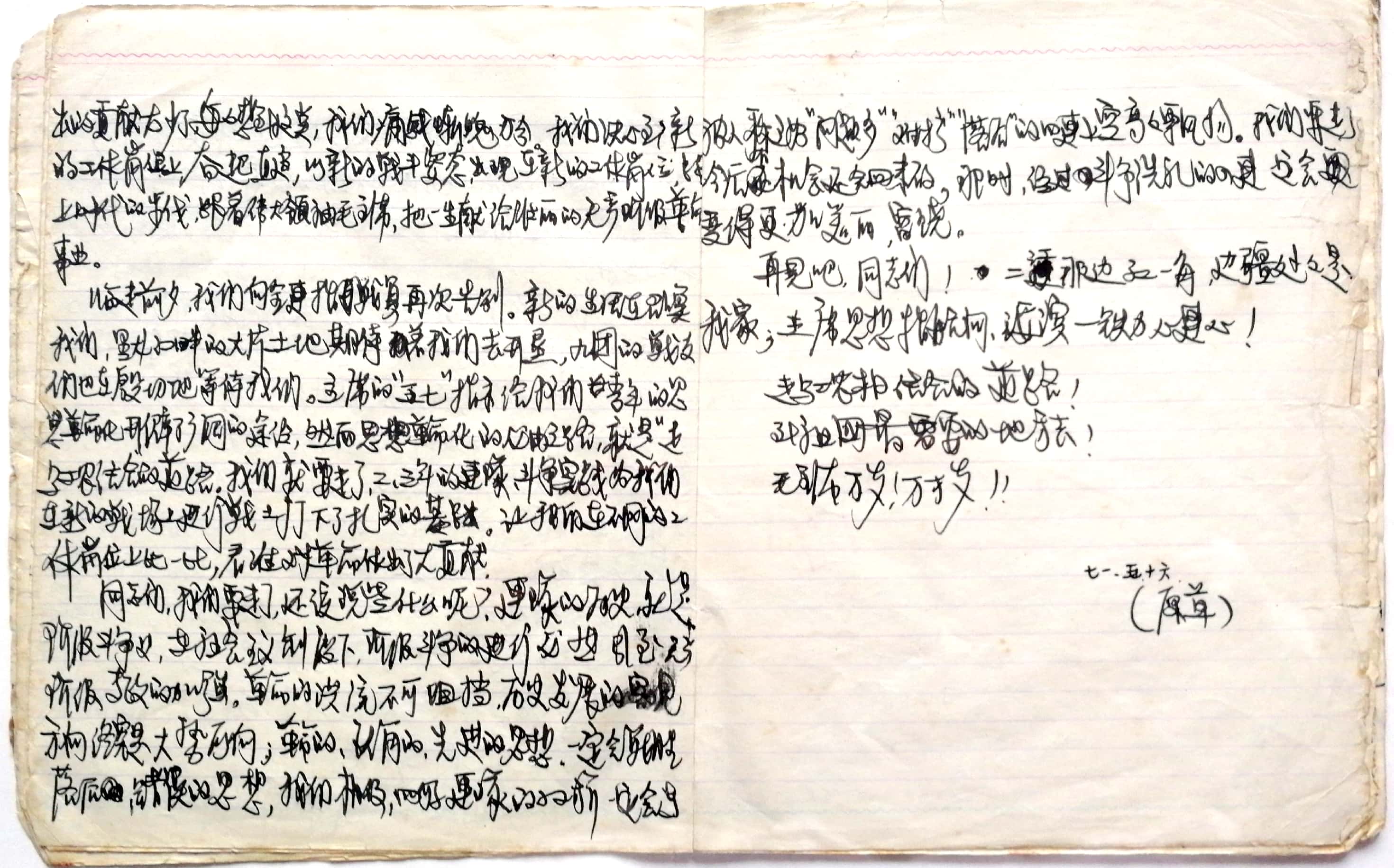 在老辰光网纪念毛主席广阔天地大有作为批示发表65周年编辑的《广阔天地 大有作为专辑》出版之际,回顾五十年前的今月,我代表连队赴地处中苏边境九团的战士,写下这篇发言稿,是理想的壮怀,是时代的特征,是知青的激情,是永恒的励志。 1971年5月,黑龙江生产建设兵团决定从二师独立二团抽调部分战士支援九团。当时我所在的独立二团四连,经动员各排都报了名,最后连部决定我排调九团。5月16日这天一早,排里把代表赴九团全体人员在全连欢送会发言的写稿任务交给了我。九团地处黑龙江省东北部系黑龙江与松花江两江汇合处,紧靠中苏边境,条件更艰苦,赴九团无疑是第二次上山下乡。几天来,调动名单宣布后,连队里有哭的,有笑的,也有闹情绪的,宿舍里已是一片喧腾。在这样的环境和气氛下,我趴在土坑上,铺开纸,心潮澎湃,思绪万千,从1968年9月响应号召,报名上山下乡,直至二、三年来战天斗地的情景,一幕幕地展现在眼前……。于是提起笔,将《到九团去,到祖国最需要的地方去》的发言稿一气呵成。当晚,全连在大食堂召开欢送告别大会,我们挑选了一名北京小伙子代表全体赴九团人员宣读这篇发言稿。慷慨激昂、铿锵有力的发言,似战士上战场的宣言书,显得异常悲壮,在食堂上空久久回荡。第二天,我们在全连指战员的目送下,离开了连队。全团赴九团的战士共250名,我们从铁力出发,乘军用列车,到佳木斯后取水路,在绥滨码头下船,即被分配到九团各个连队。后来老连队的人来信说,自我们走后,这篇发言稿就抄写在大食堂前的黑板报上,连队留下的知青和老职工好多天都默默无语,是怀念,还是在思索着什么……。 这篇发言稿的底稿,我已存放了几十年,每每翻开重读,都仿佛又回到了那令人难忘的战天斗地的岁月,总是从中吸取着力量,她教我牢记当年奔赴北大荒时的理想、志向和抱负,永远激励着我以北大荒艰苦奋斗的精神,去克服前进道路上一个又一个的困难,继续走完在北大荒没有走完的路。 原黑龙江生产建设兵团 二师独立二团、九团战士 宋爱国 到九团去,到祖国最需要的地方去 ——赴九团欢送告别大会发言稿 “五星红旗迎风飘扬,革命歌声多么燎亮;歌唱我们社会主义祖国,到处都是灿烂阳光。”这首广大人民群众所喜爱的革命歌曲,是歌唱我们伟大的社会主义的歌曲,她象征着哺育我们成长的祖国欣欣向荣,蒸蒸日上,日益显示出自己无限的生命力,显示出革命人民满怀信心地在通向共产主义大道上奋勇前进。随着歌曲的旋律,革命的时代向前迈进。祖国各地到处红旗飘扬,我们兵团大寨之花遍地映开。在这种形势下,我们四连32名兵团战士肩负更光荣的战斗任务——到九团反修的最前哨去,现即将开拔了。与此同时,我们怎能不激动呢?我们的心也随着我们将进行的一场极其光荣伟大的重任而激烈的跳动。此时我们只有一个想法,为把我们一穷二白的祖国建设成为伟大的社会主义强国,为彻底埋葬帝、修、反,解放全人类而奋斗终身! 临走前夕,我们有多少知心的话要向全连共同相处的战士、职工、家属和我们的连首长倾诉……。主席的“接受再教育”、“走与工农相结合道路”的伟大指示,把我们这些生在城市,长在学校的无知青年带到农村,走进了兵团这所毛泽东思想的大学校,使我们在行动上,并且也将在或者已经从思想上与工农紧密地结合在一起了。回顾往事,追溯到我们从来以后,我们是怎样在独立二团、在四连这块土地上,历经阶级斗争、生产斗争和科学实验这三大革命运动的风浪锻炼,使我们又如何深感主席关于“接受再教育”指示的无比亲切。 临走前夕,抬头眼望连队一排排整齐的砖瓦房,远看一片片破土而出绿油油的麦苗,遥视被云雾笼罩着的雄伟的马鞍山,倾听疙瘩山下伊基米河的流水声响,不禁使我们沉入到以往与天、与地奋战的年月中去……。我们这些手不能提、肩不能扛的青年在连队领导和老职工的带领下,盖起四连第一座砖瓦房,在与天夺粮的麦收中,我们手挥镰刀,足迹全连每一块田地。在远离团部的马鞍山下,还有我们苦干三、四个月为革命采伐下的千米木材……。这一切的一切,都有我们为彻底改变农村旧面貌而流下的血汗。连队的两个阶级、两条路线、两条道路斗争的教育,乃是对我们最好、最重要、最深刻的教育,从“反右倾”直到现在的路线教育,使我们看到四连起了多么大的变化,使我们在精神上并且也在物质上获得了多么丰硕的成果,这一切都是在毛主席革命路线取得胜利的基础上得来的。忆往昔,战斗历程,历历在目,记忆犹新;看明天,昂首挺胸,意气风发,战士上战场。 临走前夕,我们向全连战士告别。我们将要离开我们的第二家乡奔赴第三个家乡。共同的革命理想使我们走到一起,现在革命工作的需要,把我们分开,这并没有什么。革命先辈为了人民的利益、为了革命的胜利、为祖国的解放、为人类最光辉的理想境界——共产主义的实现,赴汤蹈火,南征北战,四海为家,眼前我们这点工作调动算不了什么。当然,二、三年来的战斗生活,把我们命运和连队的命运连接在一起,二、三年来的革命集体把我们和自己亲密战友、知心的伴侣,团结得难舍难分,猛一离开,确实是非常留恋的。然而我们说,既然来黑龙江是决心干革命的,现在革命需要我们到前方去、到第一线去,那我们有什么可犹豫、彷徨,甚至闹情