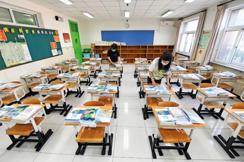8月26日,在北京市海淀区太平路小学,教师整理分发好的新学期教材。图/新华
