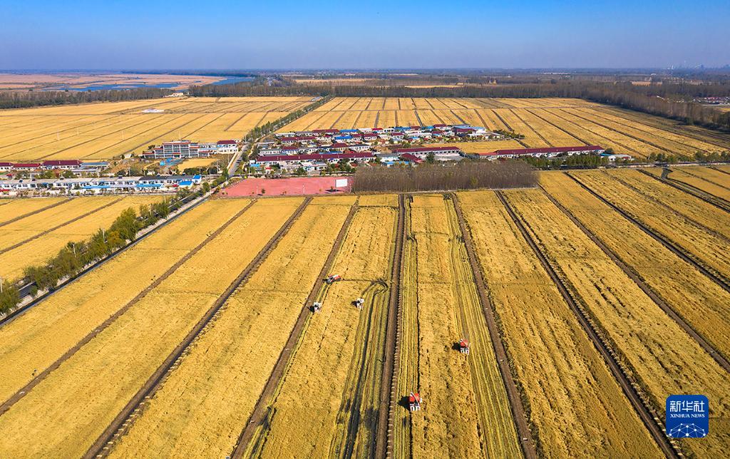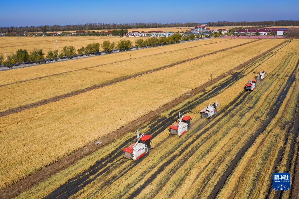 10月20日,在辽宁省盘锦市盘山县,太平凯地农机专业合作社在进行水稻机械化收割(无人机照片)。新华社发(刘刚 摄)
