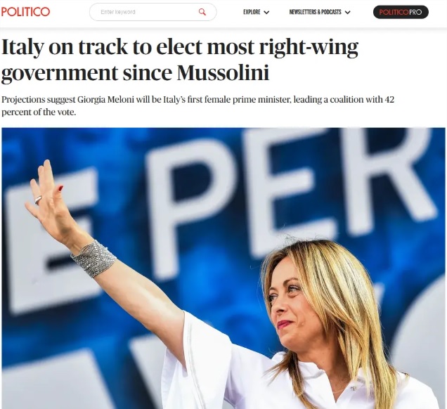 然而,这场选举中最引人注目的字眼或许是“意大利法西斯头目墨索里尼”。西方“主流”媒体与政客显得很是担心:新“墨索里尼”要来了,法西斯要来了…… 比如“政客新闻网”欧洲版和《华盛顿邮报》等媒体报道称,如果此前预测和出口民调结果准确,此次意大利选民投票选出的将是自二战墨索里尼倒台以来最右翼的政府,而来自“意大利兄弟党”的乔治娅·梅洛尼(Giorgia Meloni)将成为意大利历史上首位女总理。 截至发稿,意大利主要中左翼政党民主党承认败选。梅洛尼则宣布胜选,并表示会带领下一届意大利政府,服务于所有意大利人。 作为G7国家和欧元区第三大经济体,意大利的本次选举备受关注。这一切,正好发生在俄乌冲突之际,当前多国通货膨胀加剧,西方国家对抗俄罗斯压力重重,意大利以及欧洲的经济也到了“关键时刻”。 虽然已有所向中间靠拢,但在外界看来,此前梅洛尼所持的“反欧盟”、“反移民”等立场较为极端,其“分裂”的政治身份标签不仅会让意大利国内陷入激辩,也可能会向欧盟决策层发出具有破坏力的声音。她的反对者就警告称,梅洛尼可能会把意大利推入一个与波兰和匈牙利同处的非自由主义集团,并造成欧洲地区的局势紧张。 对此,欧盟委员会主席冯德莱恩前几日已对意大利发出警告,暗示会祭出像对波兰和匈牙利那样的惩罚措施,这番言论在意大利国内引发了轩然大波。 值得注意的是,梅洛尼在选举期间曾鼓噪对华强硬并发表涉台负面言论,中国驻意大利使馆发言人9月23日已针对有关言论表达强烈不满和坚决反对。发言人强调,一个中国原则是国际社会普遍共识和国际关系基本准则,是中国同包括意大利在内的所有国家建立和发展外交关系的政治前提和基础。 ![]()