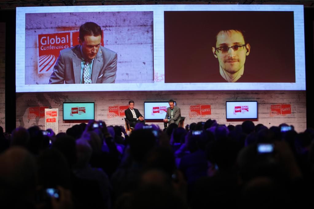 2015年3月18日,在德国汉诺威IT展,大屏幕上显示斯诺登接受采访的画面。新华社记者张帆摄