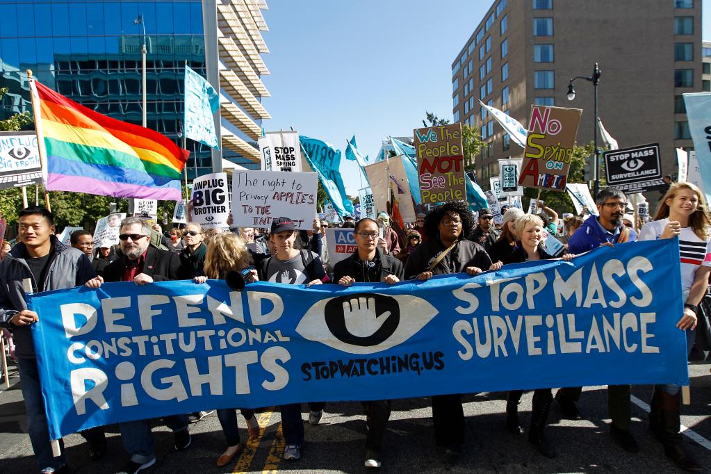 图为2013年10月26日,人们在美国首都华盛顿抗议对国内及全球民众实施秘密监控。(图片来源:新华社)