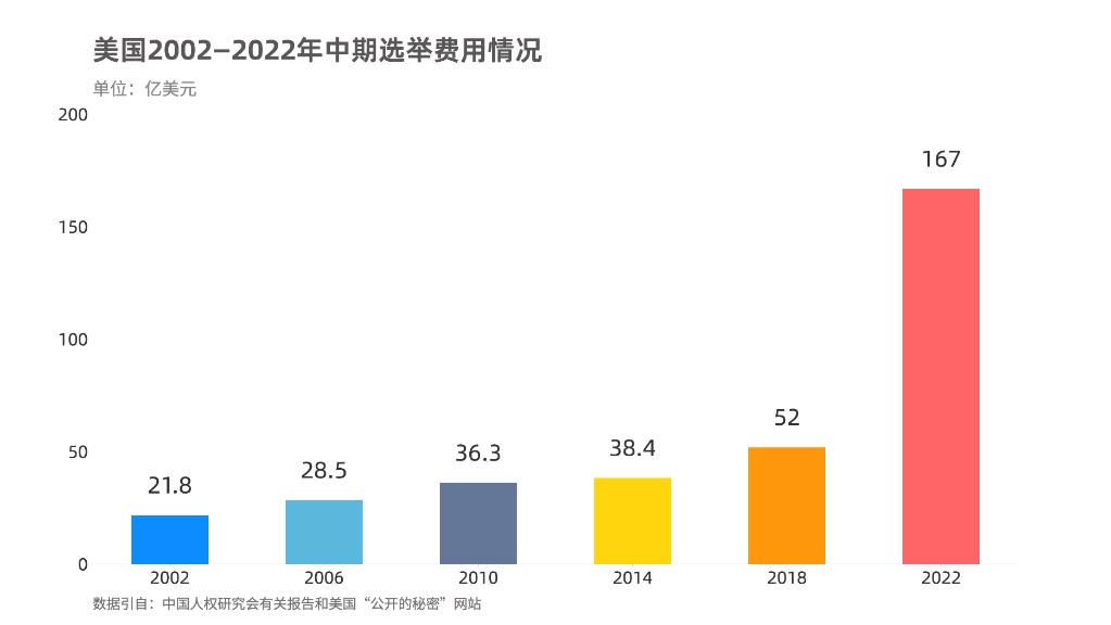 ![]() 美国中期选举于8日举行,选情胶着,“烧钱”凶猛。据美国政治捐献数据库、无党派机构“公开的秘密”网站统计,2022年联邦以及州一级选举累计花费预计超过167亿美元,成为美国史上“最贵”中期选举。 ![]() 这次选举无论对共和党还是民主党都至关重要,将影响未来两年政治环境乃至2024年总统大选。经济不景气的当下,存量博弈主导着美国政治,对社会经济资源的争夺异常激烈,这使得两党及其支持者试图孤注一掷,通过追加押注为自己“购买”影响未来政府决策的“期权”。《经济学人》刊文说,美国选举越来越“烧钱”是个长期趋势,党派对立让政治愈发成为“零和游戏”,因此利益集团和个人捐助者下的“赌注”也会更高。 社会撕裂是助推美国选举“涨价”的重要因素。贫富分化、政治极化、身份政治等因素导致群体利益冲突裂痕无处不在,疫情、堕胎、控枪、基建、公共债务等涉及经济民生方方面面立法,均成了党争博弈的擂台和筹码。如果说过去一个政党为了争夺选民要在十个政策问题上买广告影响选民,如今却可能要在二十甚至更多问题上投放广告,有些关键话题的广告支出还可能成倍增加。据美国全国公共广播电台报道,民主党今年在堕胎议题上的广告投入就是2018年中期选举的近20倍。 ![]()
