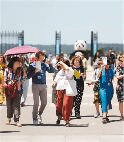 西班牙今年夏天首波热浪目前正席卷该国大部分地区,8个自治区已发布高温预警。图为近日,游客顶着酷热在西班牙马德里游览。