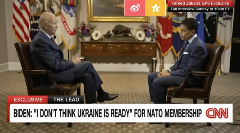 据美国有线电视新闻(CNN)当地时间7日报道,在当天接受CNN主播扎卡里亚采访时,即将赴立陶宛参加北约峰会的美国总统拜登解释了为什么他认为乌克兰加入北约的时机还不成熟。他表示,因为俄乌冲突仍在进行,一旦乌克兰现在加入,就意味着“我们与俄罗斯开战了”。