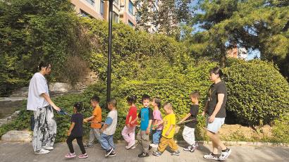 对于开在住宅楼里的托育点,小区的公共空间也是托育点小朋友的活动场所。下午3时,“左邻右舍”托育点的8个孩子拉着户外牵引绳排成一列去滑滑梯,两名保育员一头一尾负责看护。 均 王倩 摄