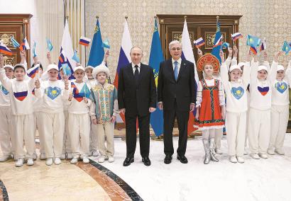 27日,哈总统托卡耶夫(中右)与俄总统普京在阿斯塔纳合影。 新华社发