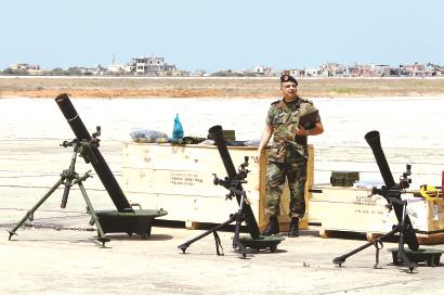 在贝鲁特国际机场,一名士兵从美国援助武器的旁边经过。新华社发(资料照片)