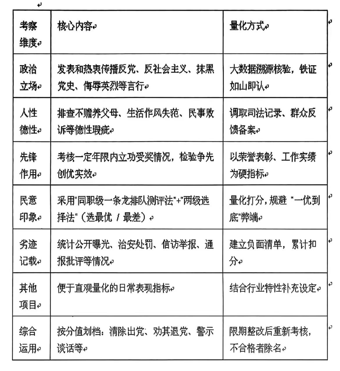 这一体系是笔者经过多年研究并在某些方面实际运用,取得良好效果基础上提出的,其核心逻辑是:通过量化指标避免“人治”,可极大地规避权力滥用导致的评价不公,也可让基层群众在有序前提下保留充分的话语权和评价权,使整党整风中对党员的评价和处理有章可循、有果可依,既能起到清理队伍、遏制腐败的作用,又能实现激发党内生机、调动争先创优积极性的效果。但作为一项涉及面广的重大工程,还需要进行大量的系统性研究与细化,以使其进一步完善,特别要注意平衡“惩戒力度与容错空间”配套等问题。