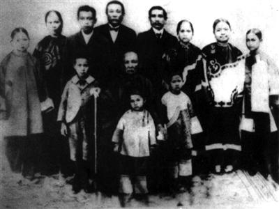 1901年4月,孙中山和家人在檀香山合影。中坐孙母杨太夫人,前立次女孙婉,左立儿子孙科,右立长女孙娫。后排左四孙眉、左五孙中山