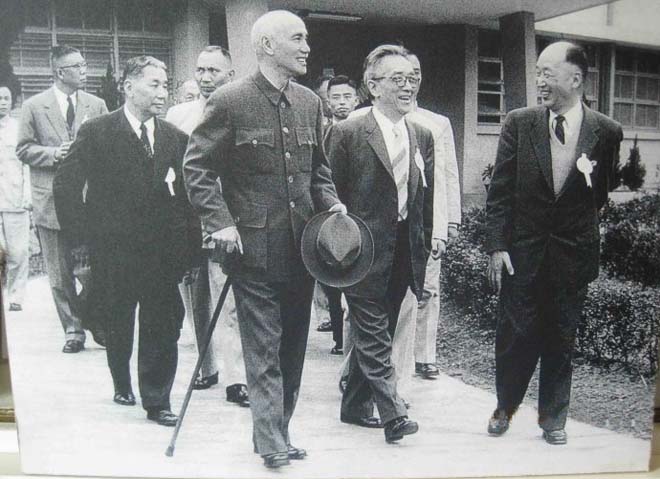 蒋介石1958年4月10日于台北南港与新任“中研院长”胡适合影