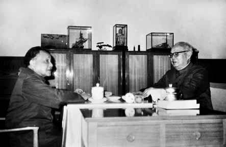 1981年9月,叶剑英发表《关于台湾回归祖国实现和平统一的方针政策》的谈话。邓小平将这篇讲话的精神概括为“一国两制”,并做出了系统的阐述。图为1979年12月,邓小平和叶剑英在一起。