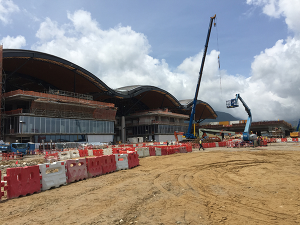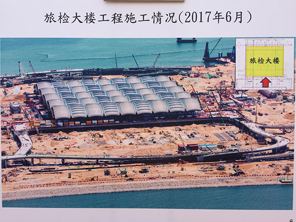正在建造的旅检大楼,楼顶为呈波浪型的天幕。