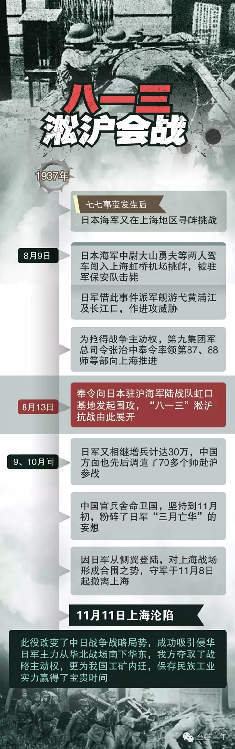 1937年8月13日起的历史三个月,在长江三角洲冲击平原上,爆发了一场中国军队在正面战场上抗击日本侵略军的大会战,这场会战不仅成为了全面抗战以来爆发的第一场大会战,也是全国抗战开始以来时间最长、规模最大的一次战略性会战,同时也是世界反法西斯战争中第一次大规模会战,史称八一三淞沪会战。