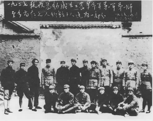 1937年,部分参加过秋收起义的同志的合影,后排左三为毛泽东同志。(资料图片)
