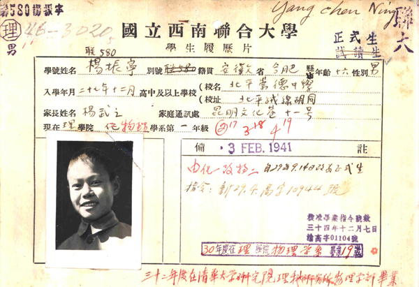 杨振宁在西南联大时的学籍卡。 清华大学档案馆 图