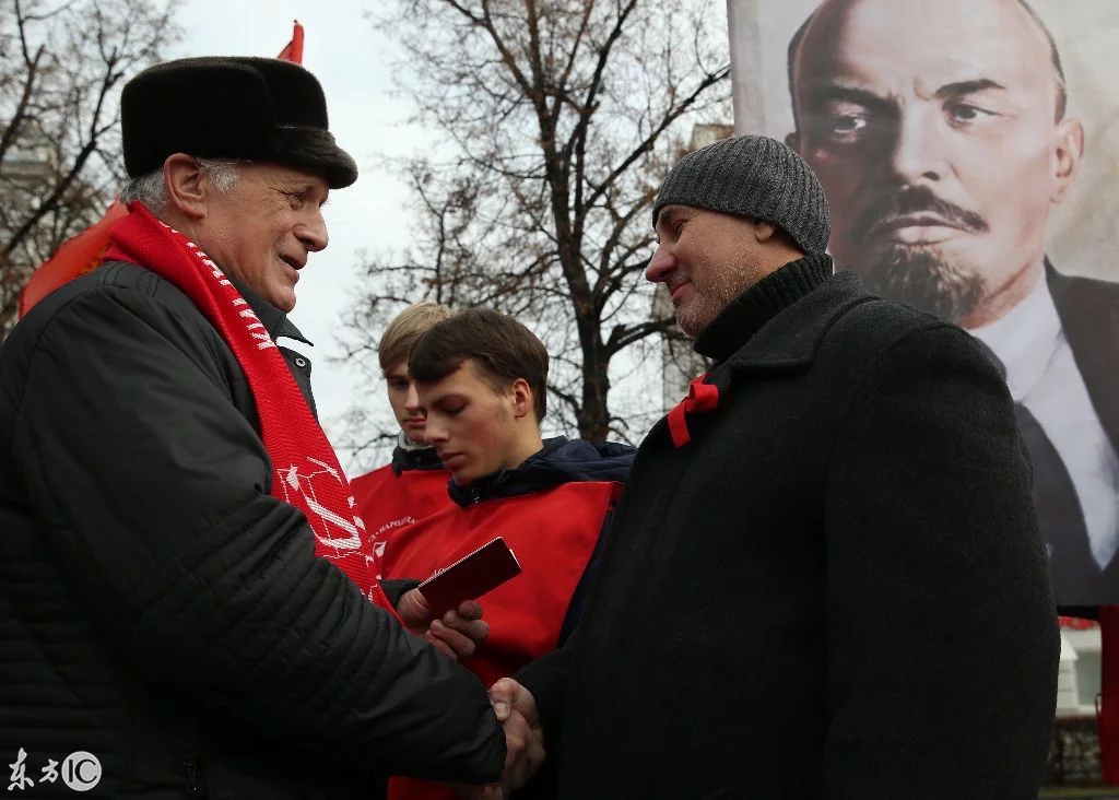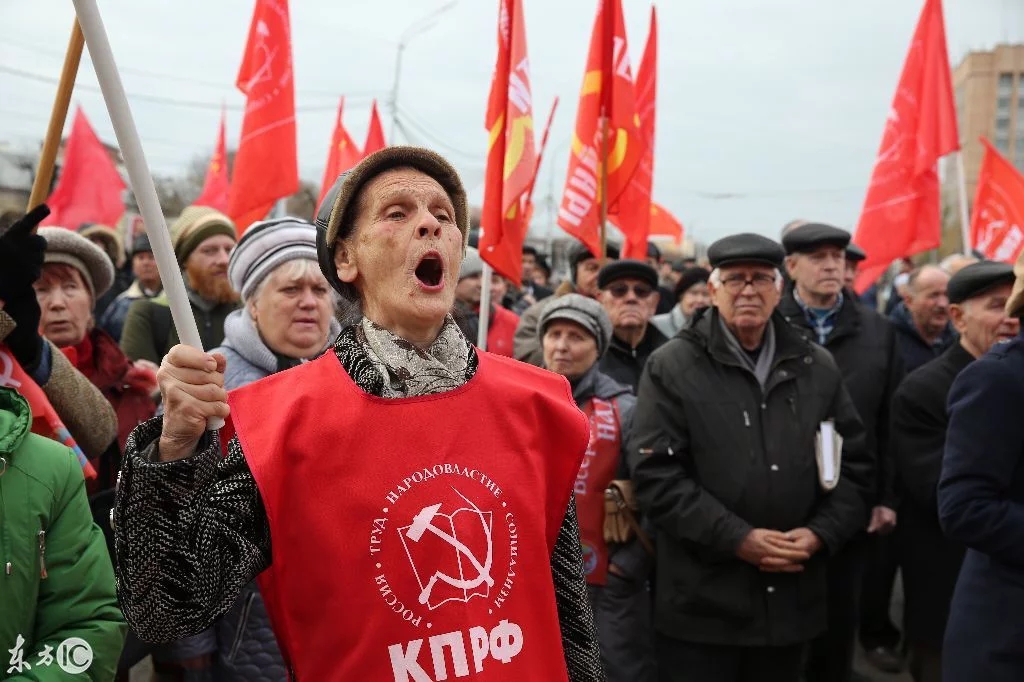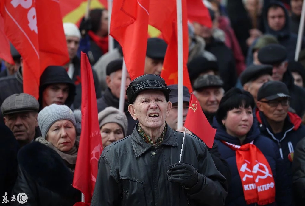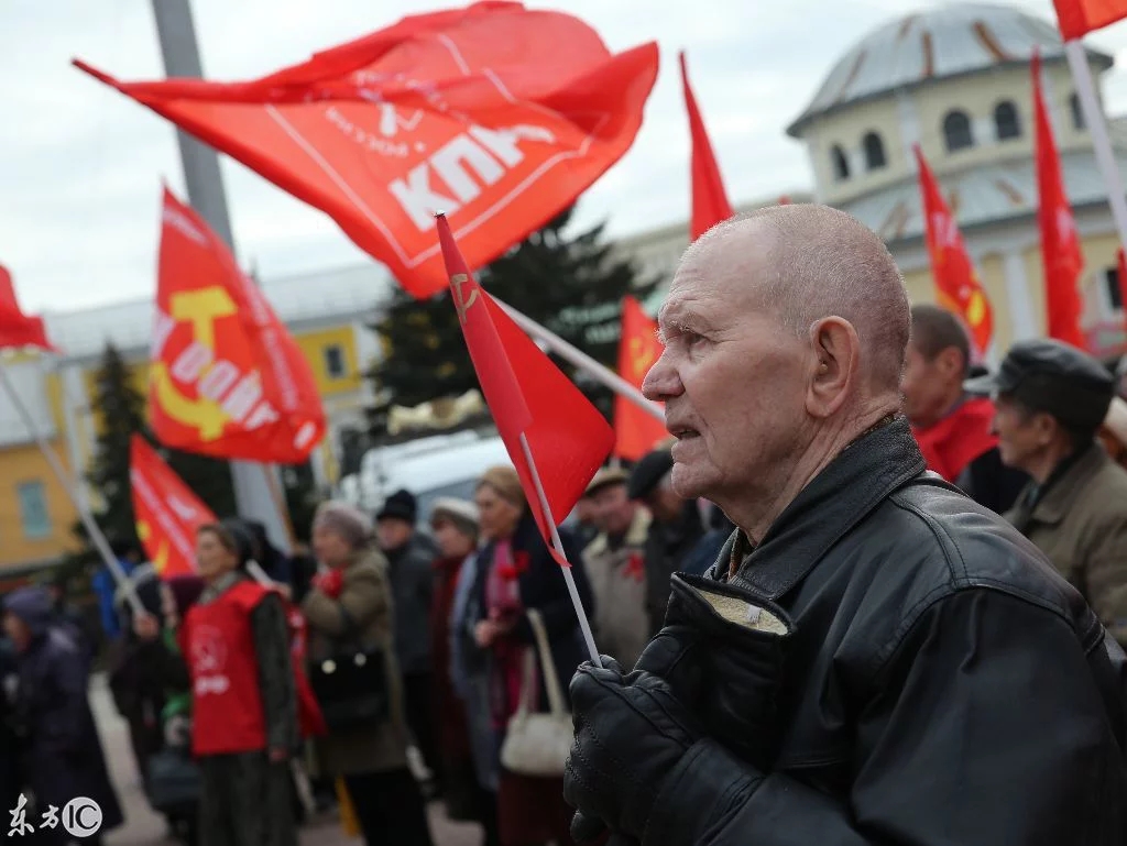 2017年11月6日,俄罗斯RYAZAN,俄罗斯共产党举行集会纪念1917年布尔什维克革命一百周年。民调显示俄罗斯人民对十月革命的积极评价越来越多。相当多俄罗斯人怀念十月革命,甚至向往能回复苏联时代。