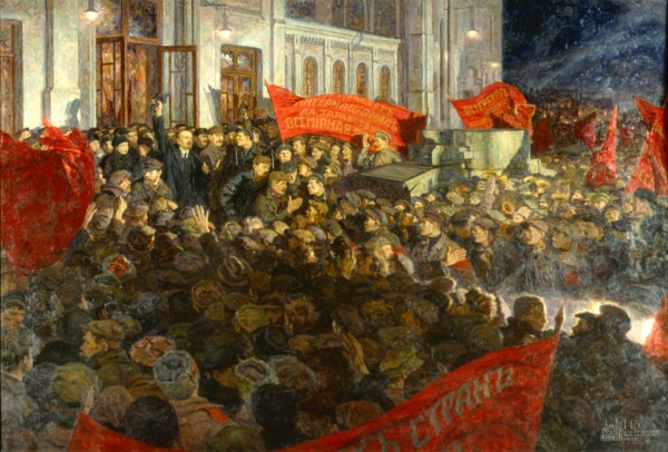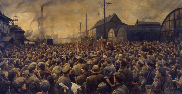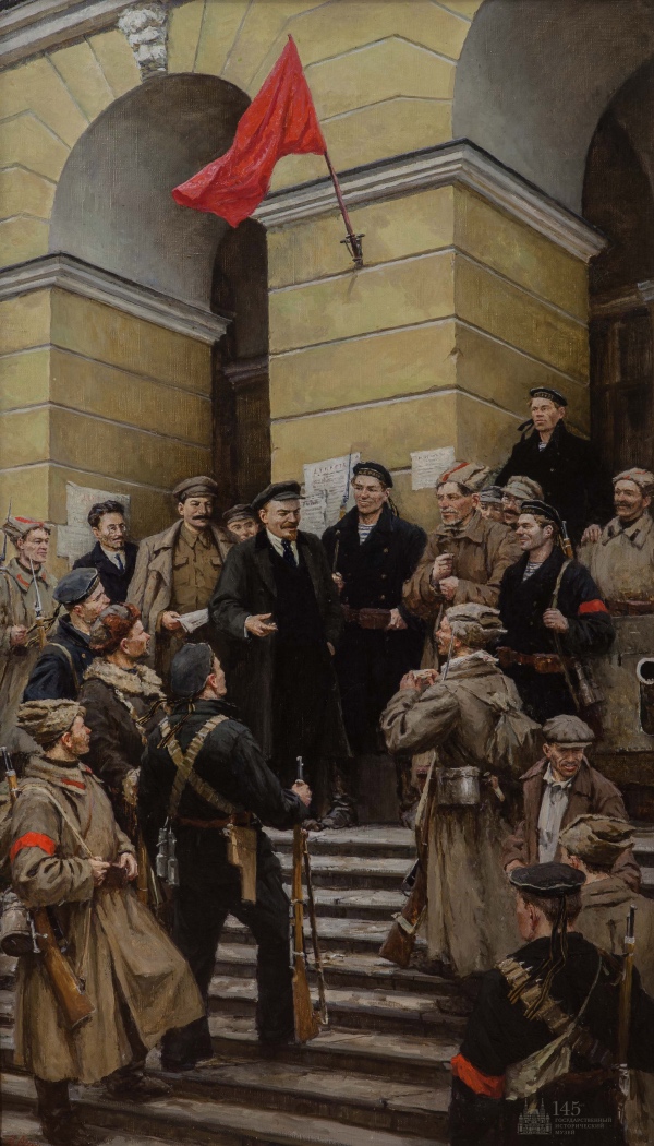 有关展览详细图文内容,请看本报记者第一时间发回的报道—— 第一部分“伟大的革命”,展示了“阿芙乐尔”号巡洋舰舷窗、“十月革命万岁”旗帜等珍贵文物和20余张描绘十月革命、重大事件的油画作品,其中包括:勃罗茨基的《1917年5月列宁在普基洛夫工厂工人大会演讲》、谢洛夫的《列宁在全俄苏维埃第二次代表大会上讲话》、格拉西莫夫的《列宁在讲坛上》、索科洛夫-斯卡利亚创作的《向冬宫突击》等经典历史题材绘画作品。此外,本部分还将展出系列照片和明信片,它们是1917年2月至10月独特的大事记,展示了革命事件在俄罗斯两个主要城市彼得格勒和莫斯科的紧张节奏。 1. 《1917年5月列宁在普基洛夫工厂工人大会演讲》由伊萨克·伊兹赖列维奇·勃罗茨基创作于1929年。在普基洛夫工厂大会上,列宁号召工人们为反对资本家和地主而斗争。画作的创作者勃罗茨基曾跟随列宾学习,其作品以严格的、精确的、细致的素描功力见长。画作中,勃罗茨基尝试将“领袖至上主义哲学”表现为领袖和人民的团结。